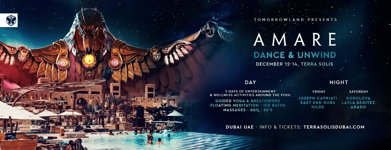 A one-of-a-kind, immersive movement and music experience by Tomorrowland. AMARE blends dance, wellness, sound and energy rituals inside a beautifully curated desert setting. (21+ only)